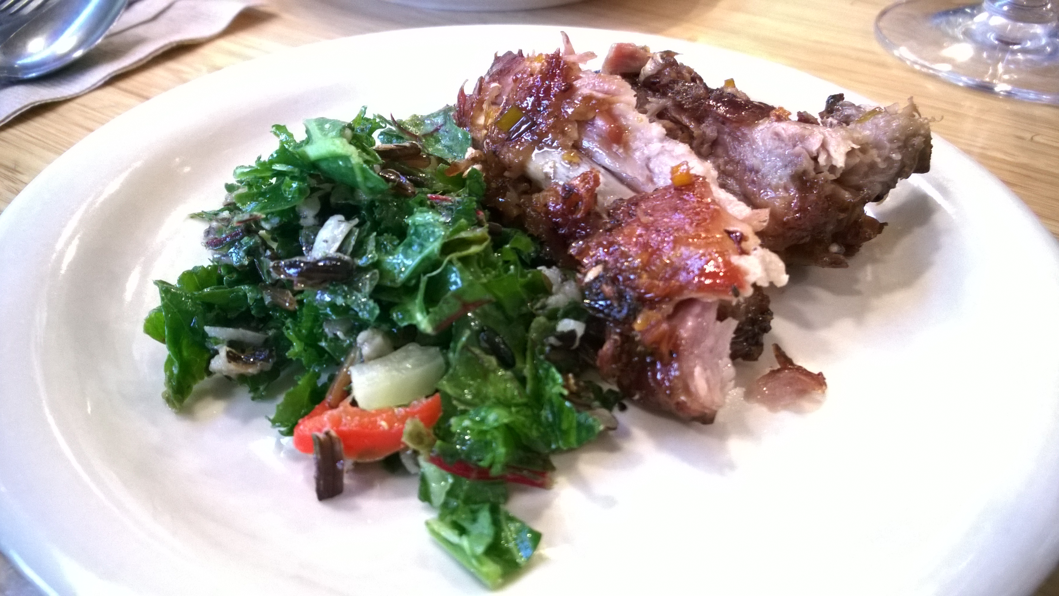 I’ve worked through about a half-dozen of the recipes in the book so far, and some of them multiple times. For the most part, the recipes are things you can do after work, but aren’t 20-minute wonder dishes. They take a little chopping and prepping. Add in cook times, and I’ve found I typically need an hour to put together a full meal. Most recipes are meant to by a one-dish wonder, though we add a separate veggie dish most of the time. They just need a starch like rice or bread to accompany them. The recipes tend to be a bit strong in use of some flavors, especially citrus. I usually had to cut back on fresh lemon or lime juices or the citrus was overpowering the other flavors. So far I think our favorite was the broiled leg of lamb, just be judicious with the orange zest. We paired it with a red kale sautéed in ginger, garlic and olive oil, and it made a great compliment. The wine below is a Chateau Ste. Michelle sweet Riesling. It’s not a great pairing, but it is one of my favorite wines. Light, sweet and refreshing.
